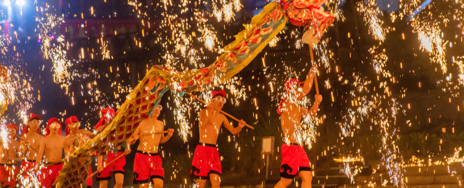 值此龙年之际,铜梁龙舞无疑是各大庆典中最具感染力和氛围感的表演之一。铜梁龙舞起源于中国西南部重庆市铜梁区,其历史可追溯至明朝(1368-1644年),并在清朝(1644-1911年)达到鼎盛时期。铜梁龙舞所使用的龙道具由24节组成,象征着中国传统历法中的二十四节气。根据不同场合及具体要求,龙的长度可延展至50节甚至100节以上。在盛大庆典中,最多可看到九条巨龙同时起舞。“铜梁是‘龙舞之乡’,铜梁龙舞在其悠久的历史中,已经演变出20多种不同的形式。”铜梁区非物质文化遗产保护中心主任宗和云表示。其中,火龙舞是铜梁最具特色的民间表演之一,以喷涌而出的火焰和高高迸射的铁花为特色。赤膊舞龙者在铿锵有力的鼓乐和锣声中表演,场面震撼而壮观,充满了热烈、宏大与奇妙的氛围。作为首批国家级非物质文化遗产之一,铜梁龙舞享誉国内外。近年来,它频繁亮相中央广播电视总台的舞台。铜梁龙舞不仅多次出现在国内重大庆典中,如35周年、50周年、60周年和70周年国庆庆典、2008年北京奥运会开幕式、2010年上海世博会以及2019年北京世界园艺博览会等,还在包括美国、英国、法国、澳大利亚和新加坡等在内的30多个国家和地区进行了300多场文化交流演出,将这一独特舞蹈的壮丽艺术魅力带向更广泛的全球观众。(图片来源:https://news.cgtn.com/)